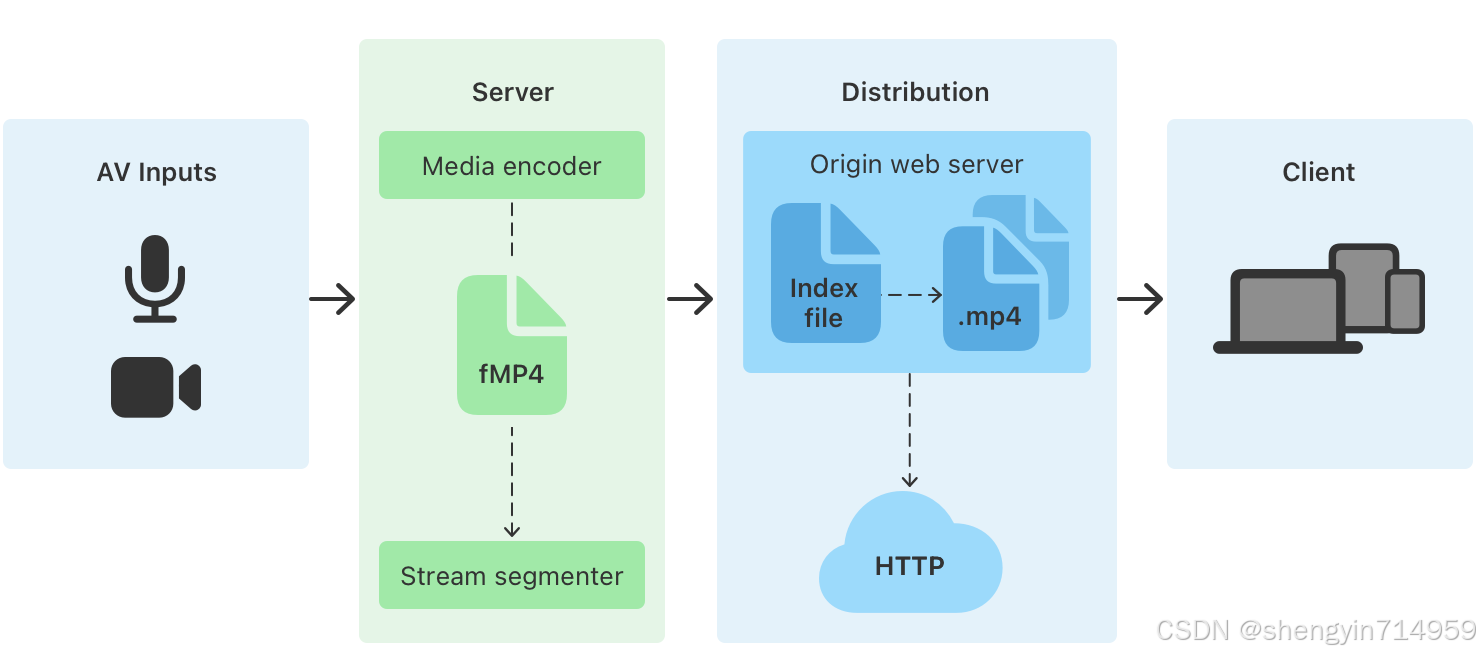 我们先看下HLS整体架构,由三部分构成:服务端、CDN分发、客户端,切片文件可以是ts或者mp4。如下图所示:
