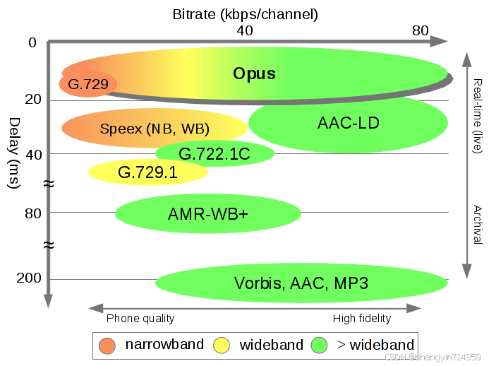 Opus、AAC、Vorbis、MP3等codec的码率与延时对比,如下图所示: