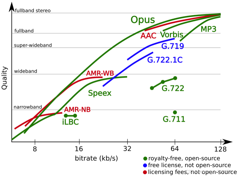 Opus、AAC、MP3、Vorbis等codec的质量与码率对比,如下图所示: