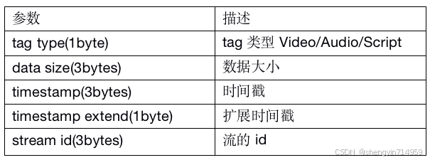 Tag的Header包括:类型、大小、时间戳、扩展时间戳、流id,如下表所示:
