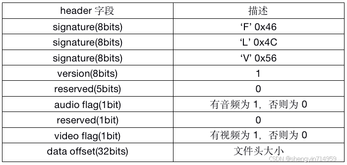 FLV的Header包括:签名、版本号、保留字段、音频flag、视频flag、文件头大小。其中,文件头大小默认是9字节。需要注意的是,bit与byte单位转换。如下表所示: