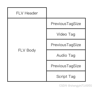 FLV是由Header和Body组成。其中Body由一系列Tag构成,包括Video、Audio、Script等。如下图所示:
