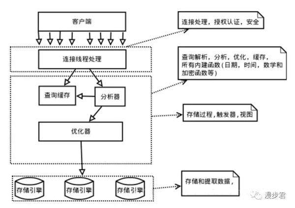 2、MySQL大多数核心服务均在中间这一层,包括查询解析、分析、优化、缓存、内置函数(比如:时间、数学、加密等函数)。所有的跨存储引擎的功能也在这一层实现:存储过程、触发器、视图等。