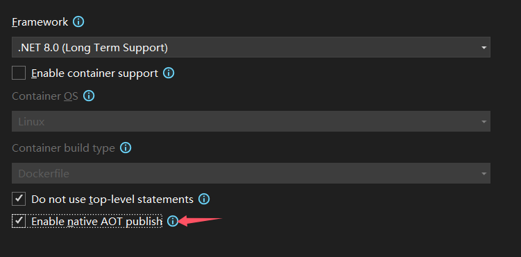 现在的VS非常强大,新建模板的时候就有一个 Enable native AOT publish 选项,勾完之后就会自动的在项目的 csproj 中添加配置节 <PublishAot>true</PublishAot> ,截图如下: