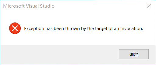 打开VisualStudio之后,会弹出错误信息 Exception has been thrown by the target of an invocation. 大概意思就是在调用目标上发生了异常,截图如下: