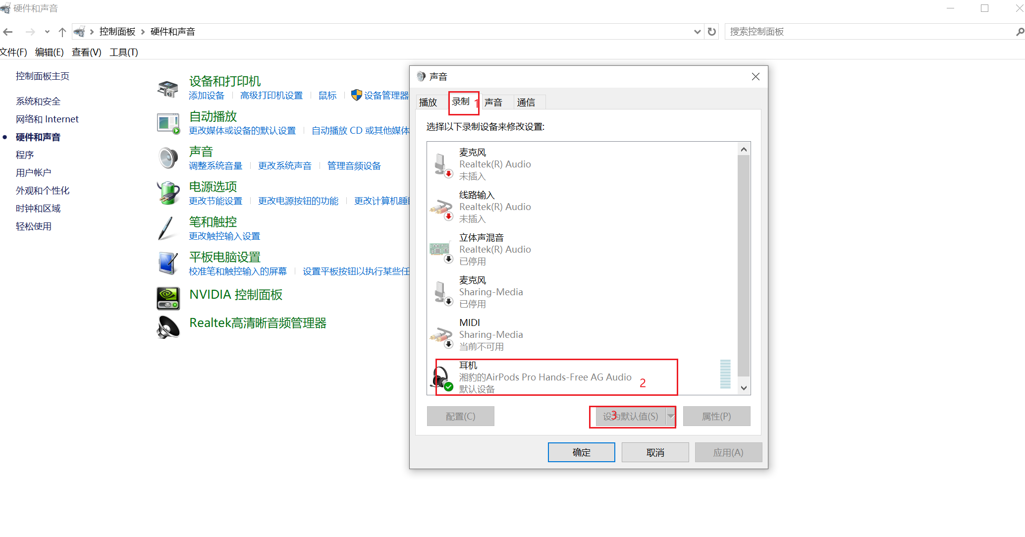 2.第二步设置录制设备:录制=》选择耳机的handfree模式=》设为默认值