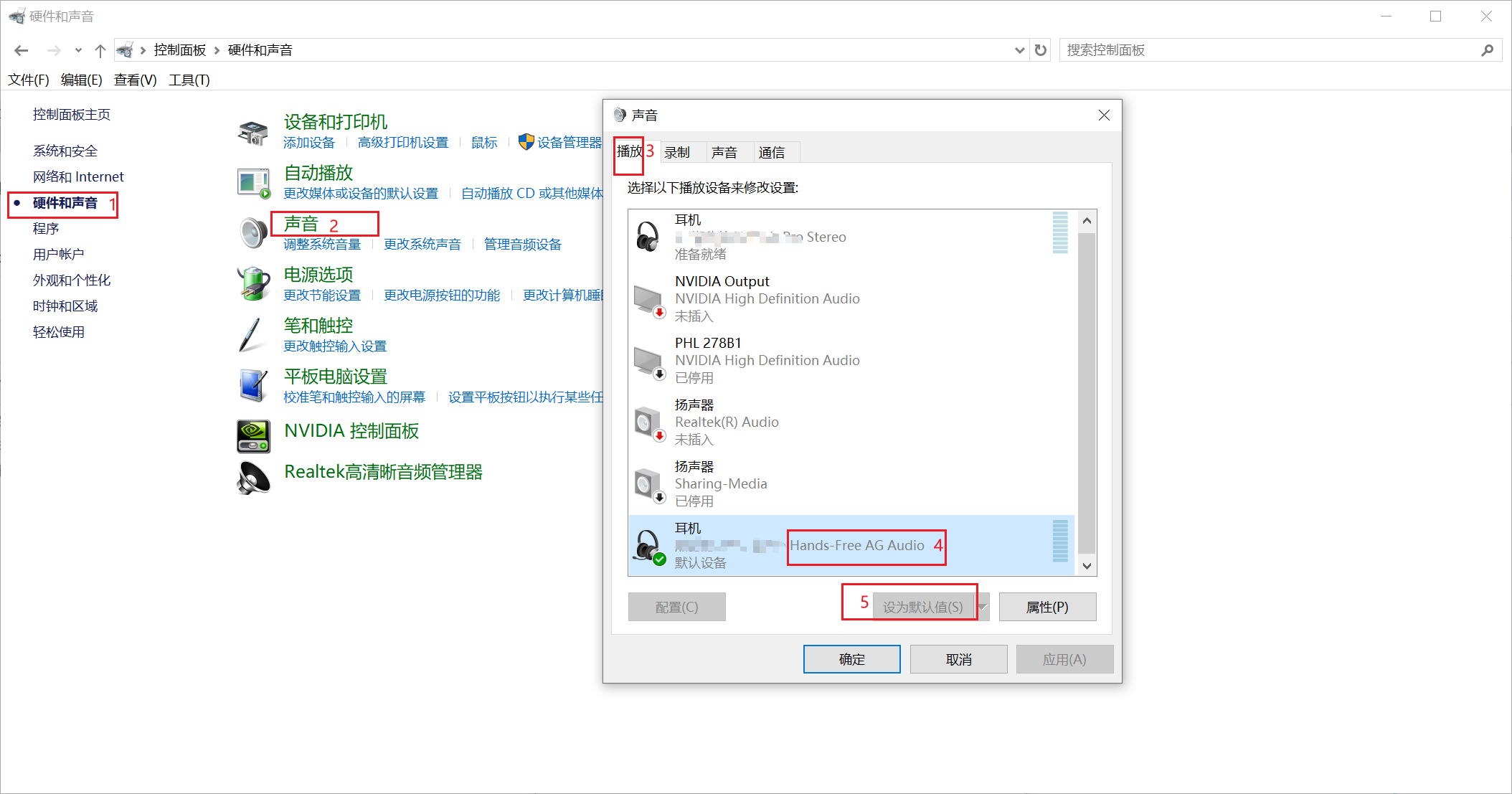 1.第一步设置播放设备:播放=》选择耳机的Hand-Free模式=》设为默认值