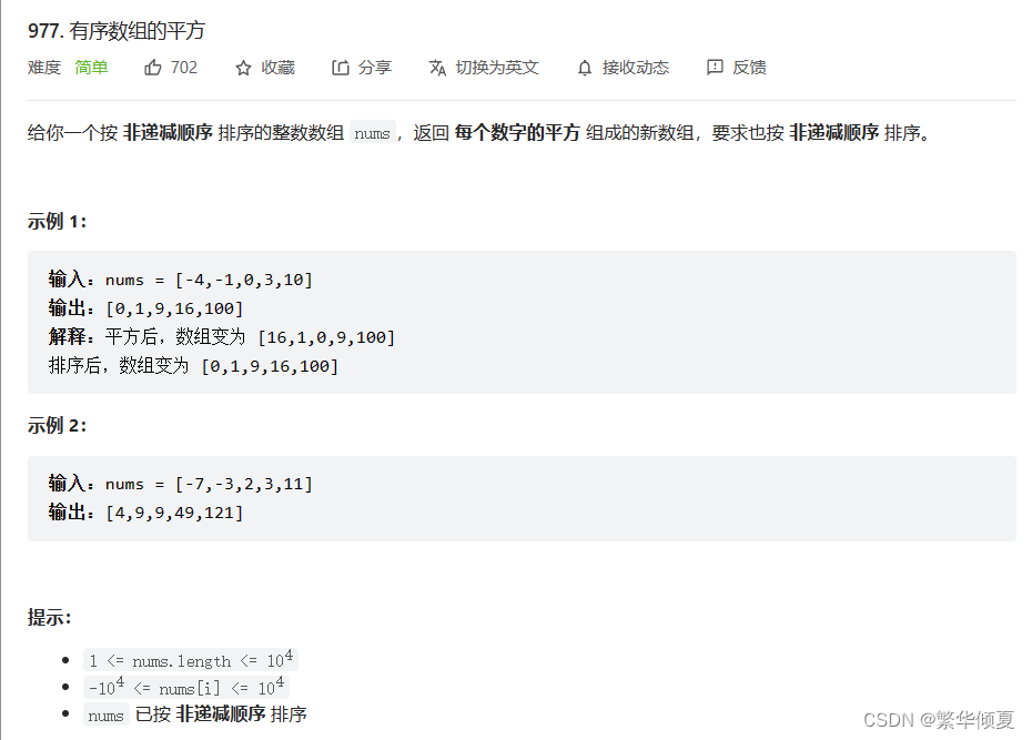 // 输入 nums = [-4, -1, 0, 3, 10]