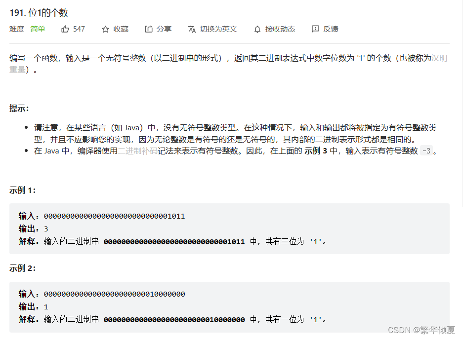 /*int hammingWeight(uint32_t n) { */ // 测试用例