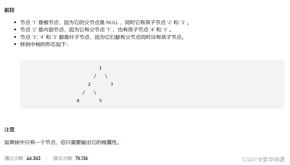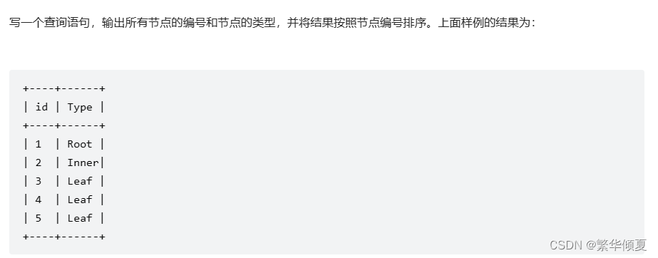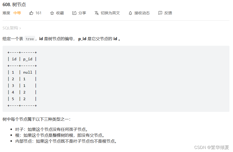 该文分享了一道关于树节点分类的LeetCode题目,使用MySQL数据库编写查询语句,分别找出根节点、叶节点和内节点。查询涉及到对树结构数据的递归理解和子查询的运用。
