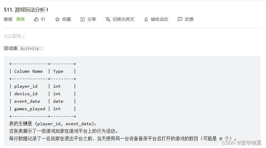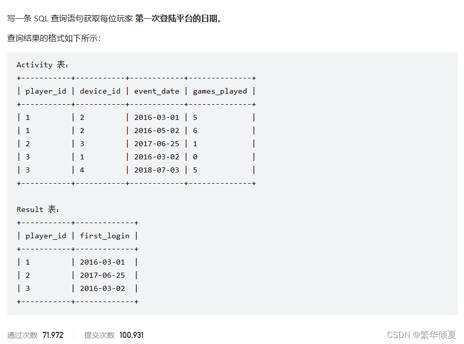 # 力扣(LeetCode):511. 游戏玩法分析 I