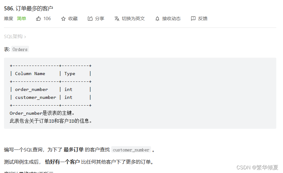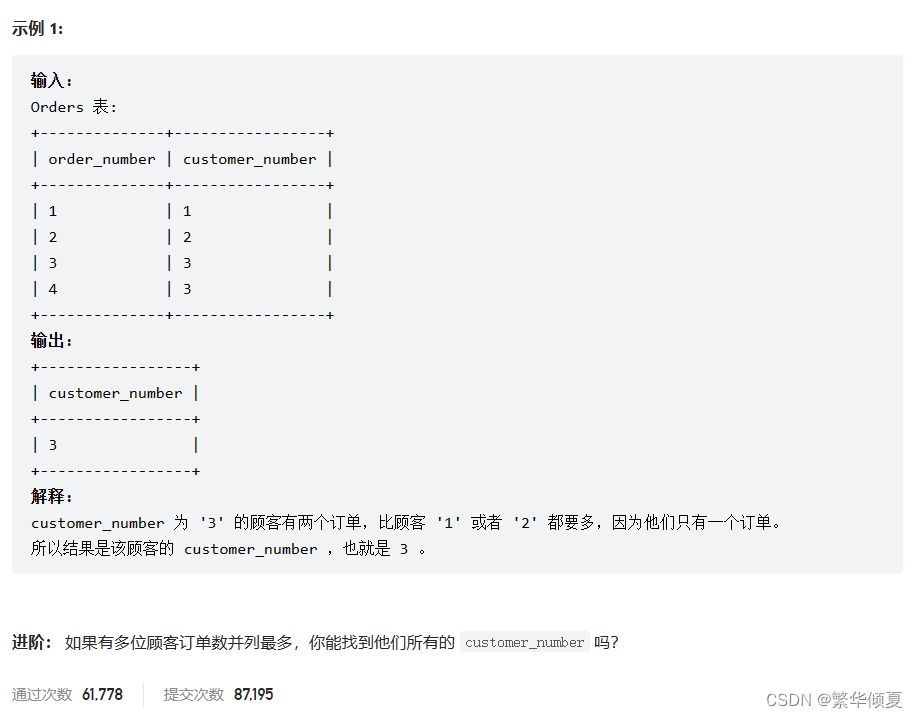该问题是一个SQL查询挑战,目的是找出在orders表中下单次数最多的客户。通过GROUPBY和COUNT(*)函数,我们可以按客户编号分组并计算每个客户的订单数量,然后按数量降序排序,最后使用LIMIT1来获取订单最多的客户。