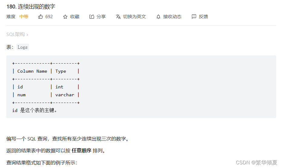这是一篇关于LeetCode第180题的题解,使用MySQL数据库解决连续数字出现的问题。作者繁华倾夏通过三条Log表的关联查询,找出连续三次出现的相同数字。