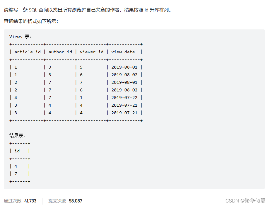 该问题涉及到MySQL数据库查询,主要解决的是在Views表中找出作者自我浏览的文章记录,通过author_id等于viewer_id来筛选,然后按作者id排序。题解作者繁华倾夏分享了每日解题心得。