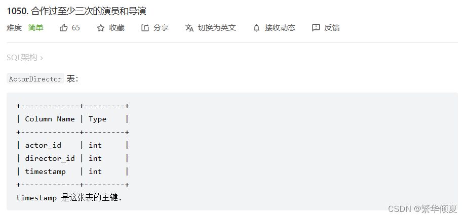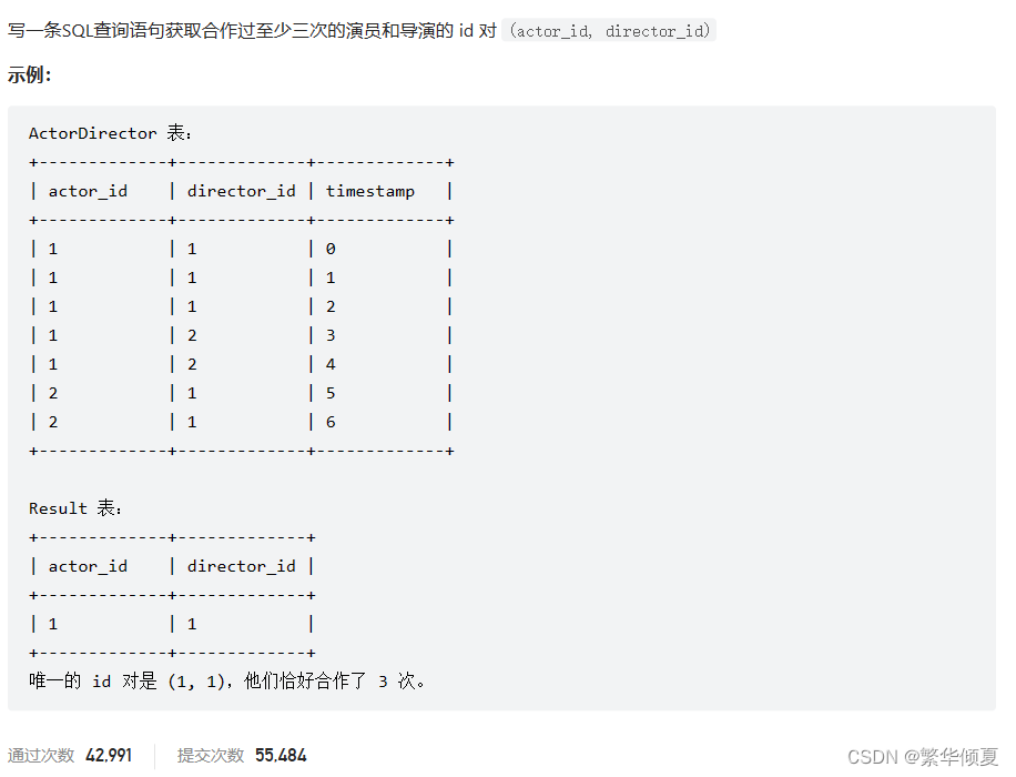 # 力扣(LeetCode):1050. 合作过至少三次的演员和导演
