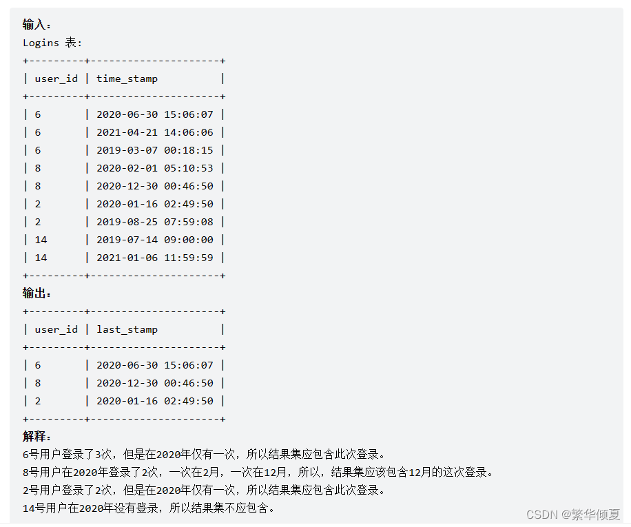 该文章分享了如何使用MySQL查询Logins表,找出在2020年内每个用户的最后一次登录时间戳,通过`max(time_stamp)`和`groupbyuser_id`实现。