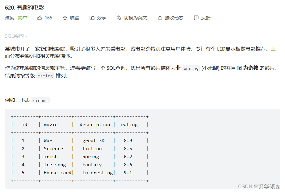 该文介绍了如何使用MySQL查询语句从cinema表中选取奇数id且描述不为boring的电影,按评分降序排列,是LeetCode第620题的解题分享。