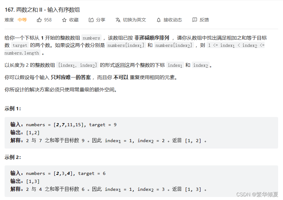 // 力扣(LeetCode):167. 两数之和 II - 输入有序数组
