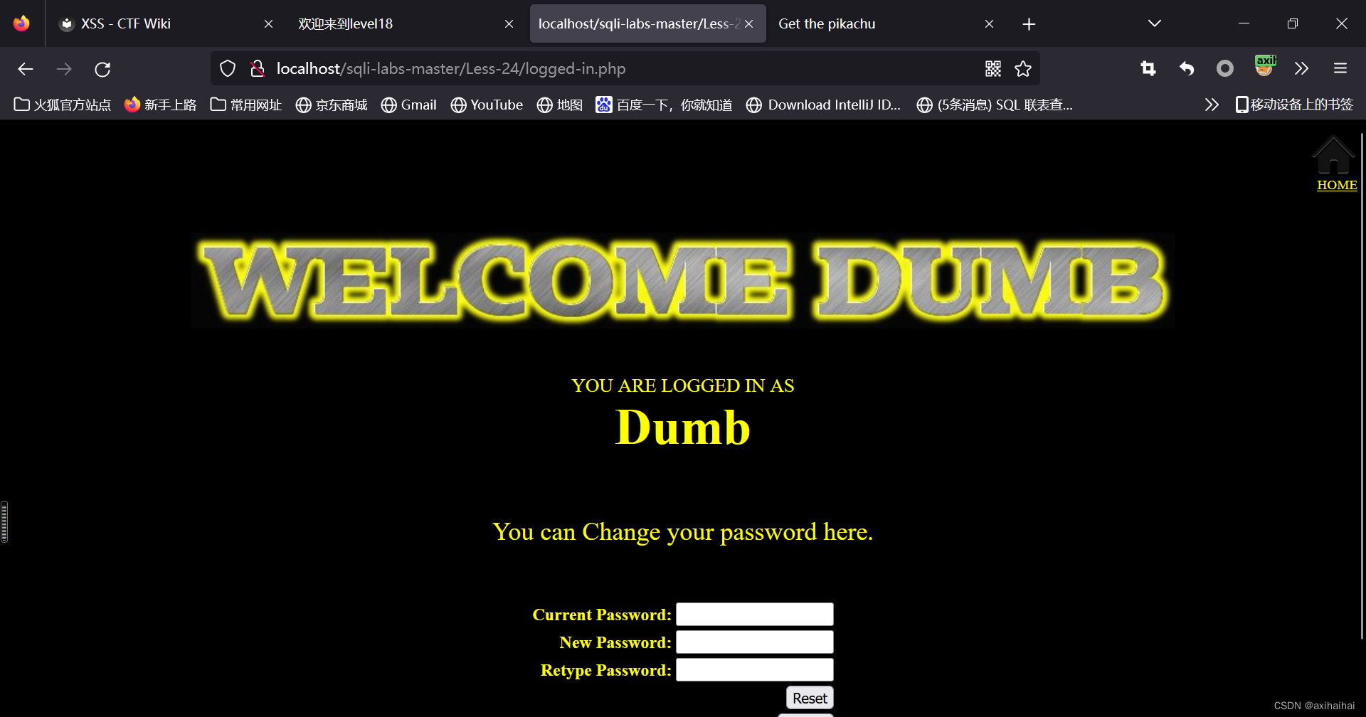 进行密码的修改 将111修改为333 则就可以利用pass_change.php里面的update语句进行Dumb'--+的注入 这下就相当于Dumb的密码修改为333