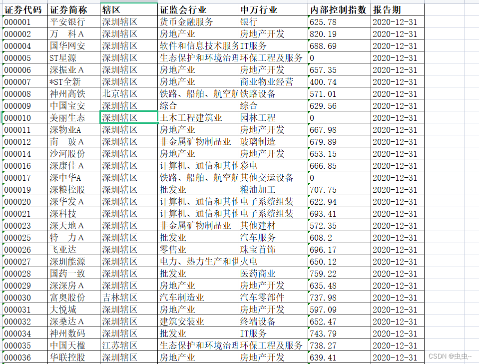 证券代码、证券简称、辖区、证监会行业、申万行业、内部控制指数、报告期