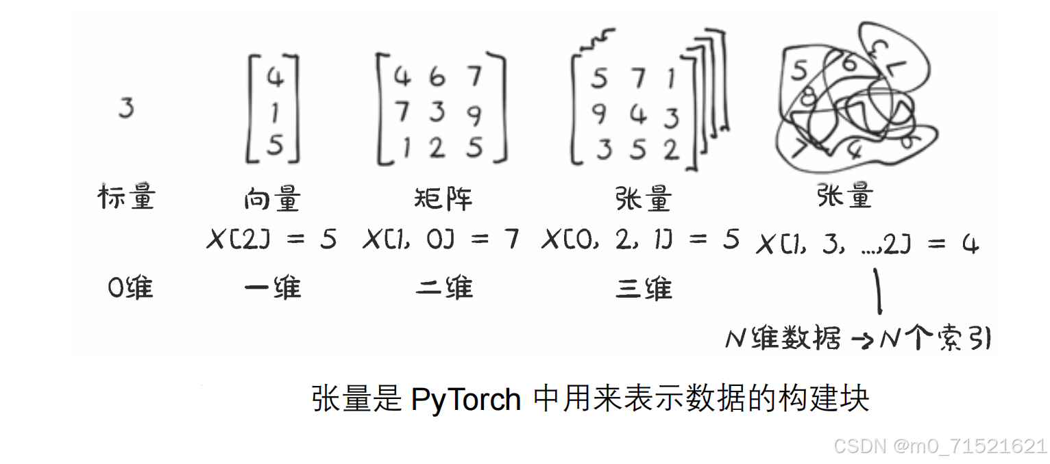 - 多维结构:张量可以表示任意维度的数据结构,从标量(零维张量)到一维向量、二维矩阵,再到更高维的张量。比如,