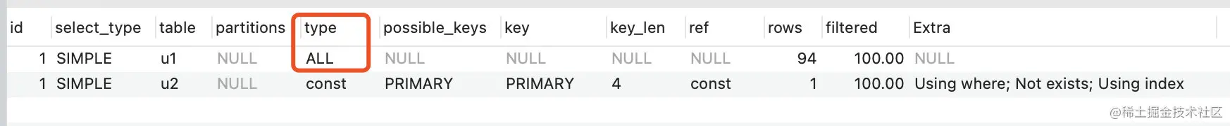 explain select * from t_user u1 where not exists (select 1 from t_user u2 where u2.id = 2 and u2.id = u1.id);