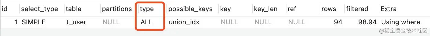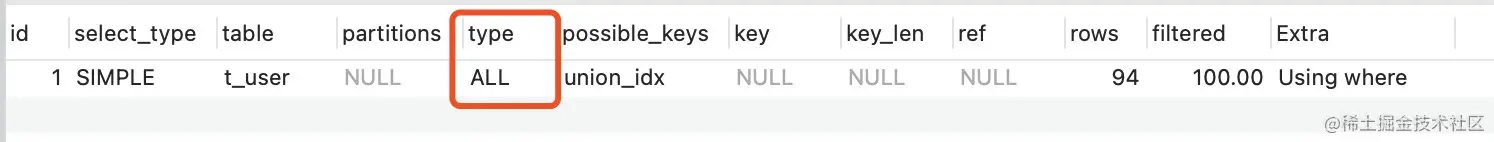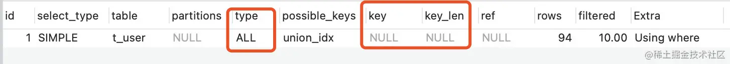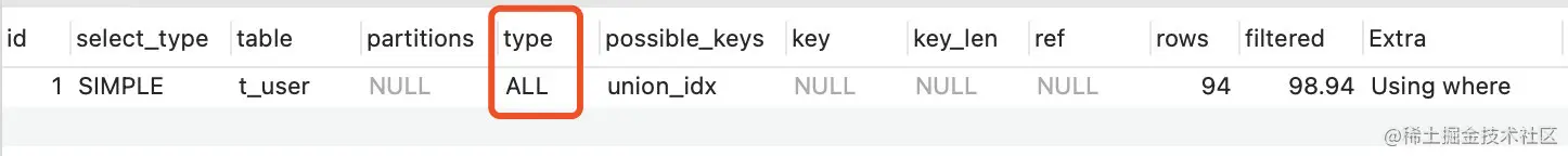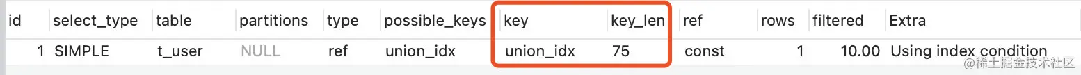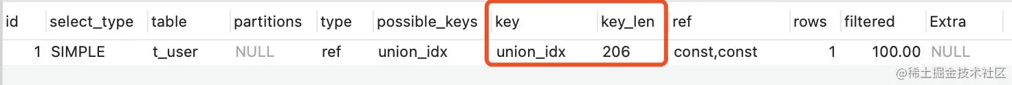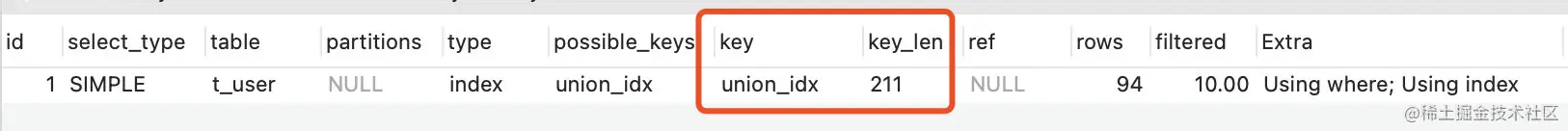 通过explain执行结果可以看出,上述SQL语句走了union_idx这条索引。