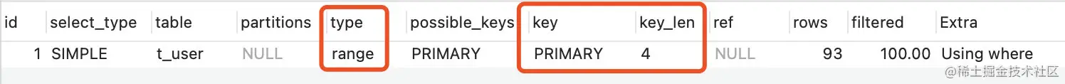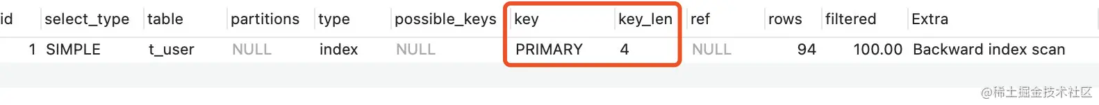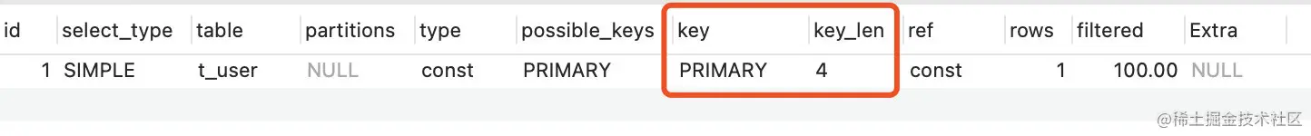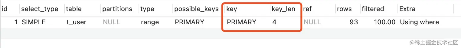 可以看到上述SQL语句使用了主键索引(PRIMARY),key_len为4;