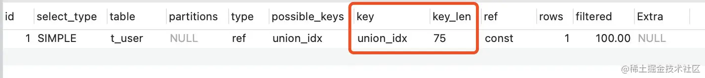 - 由于该字段运行为NULL(default NULL),需要再添加1个字节。此时,key_len = 74 + 1 = 75;