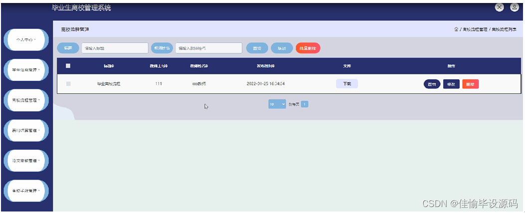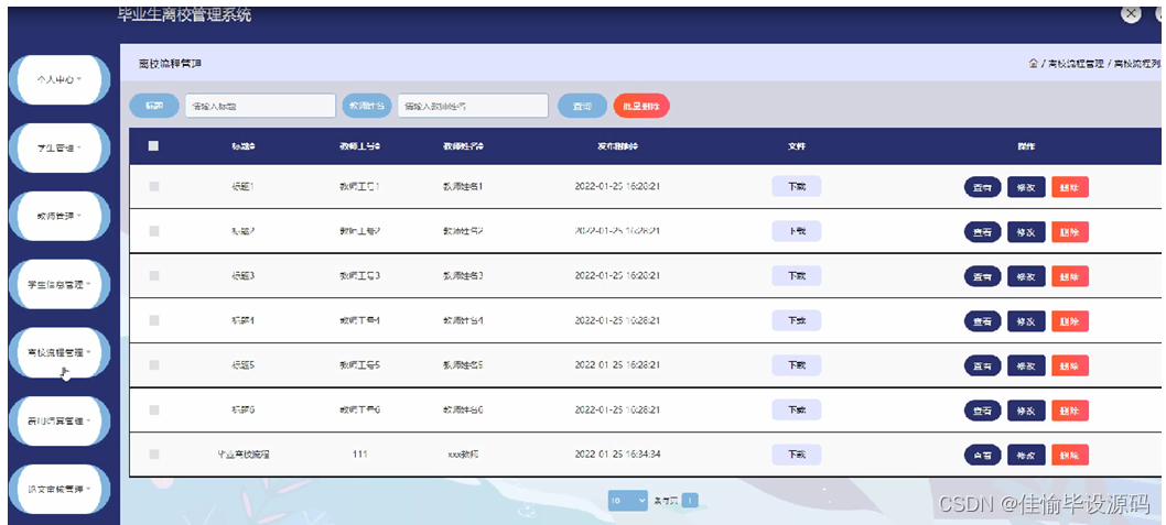 离校流程管理;在离校流程管理页面中可以对标题,教师工号,教师姓名,发布时间,文件等内容进行查看,修改和删除操作;如图5-6所示。