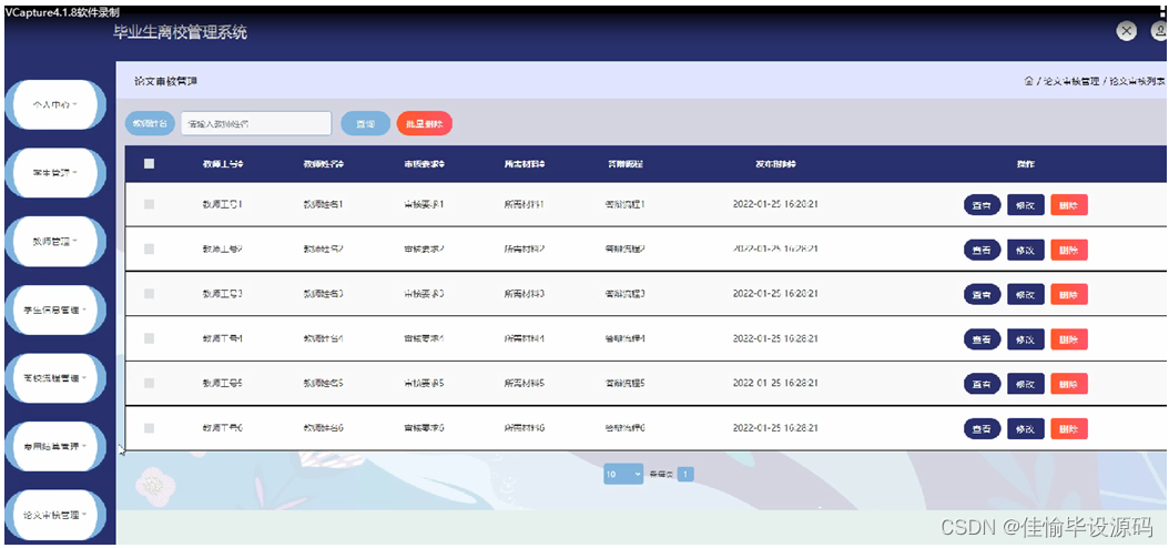 论文审核管理;在论文审核管理页面中可以对教师工号,教师姓名,审核要求,所需材料,答辩流程等内容进行查看。修改和删除操作;如图5-8所示。