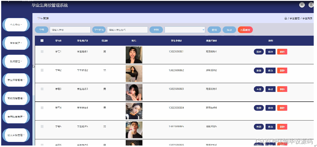 学生管理;在学生管理页面中可以对学号,学生姓名,性别,照片,学生手机,缴费名称等内容进行查看,修改和删除操作;如图5-3所示。