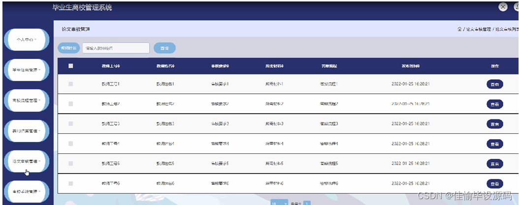 论文审核管理;在论文审核管理页面中可以查看教师工号,教师姓名,审核要求,所需材料,答辩流程,发布时间等详细内容;如图5-11所示。