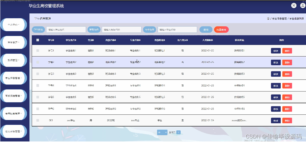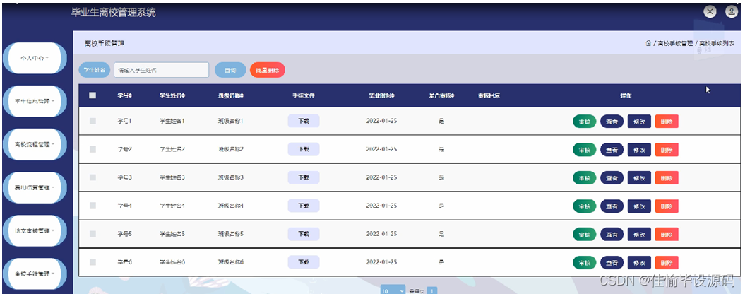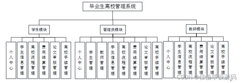 本课题要求实现一套毕业生离校管理系统,系统主要包括管理员模块,学生模块和教师模块等功能模块。