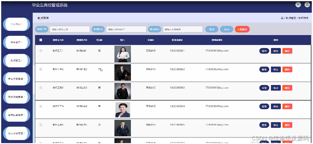 教师管理;在教师管理页面中可以对教师工号,教师姓名,性别,照片,职称,联系电话,教师邮箱等内容进行查看,修改和删除操作;如图5-4所示。