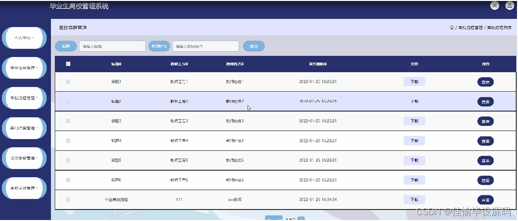 离校流程管理;在离校流程管理页面中可以查看标题,教师工号,教师姓名,发布时间,文件等详细内容;如图5-10所示。