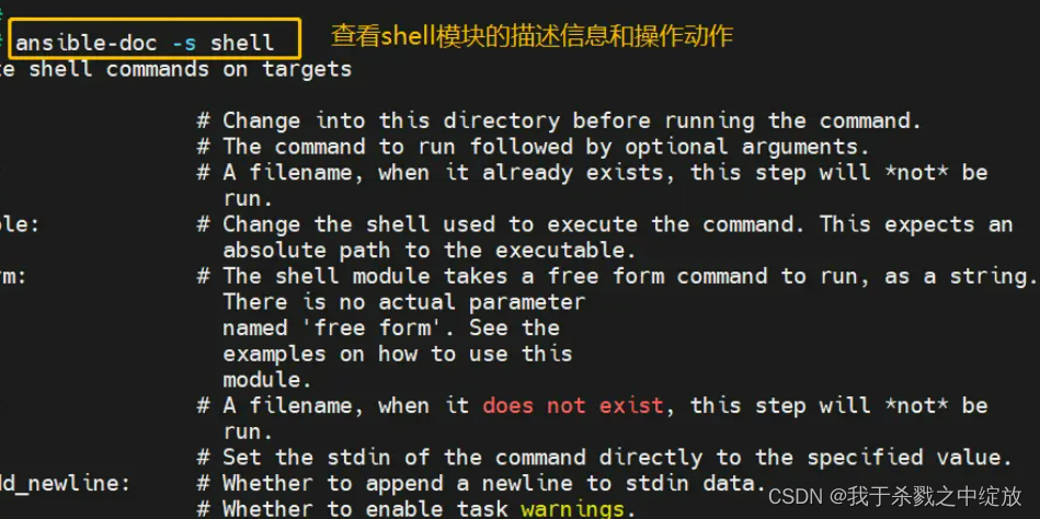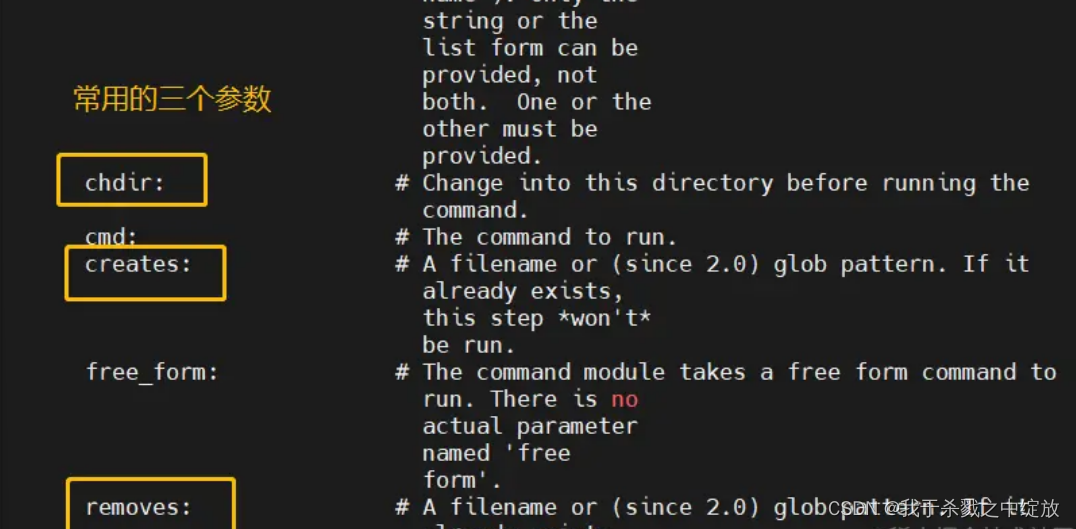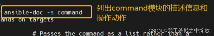 ansible-doc -s command #-s列出指定模块的描述信息和操作动作