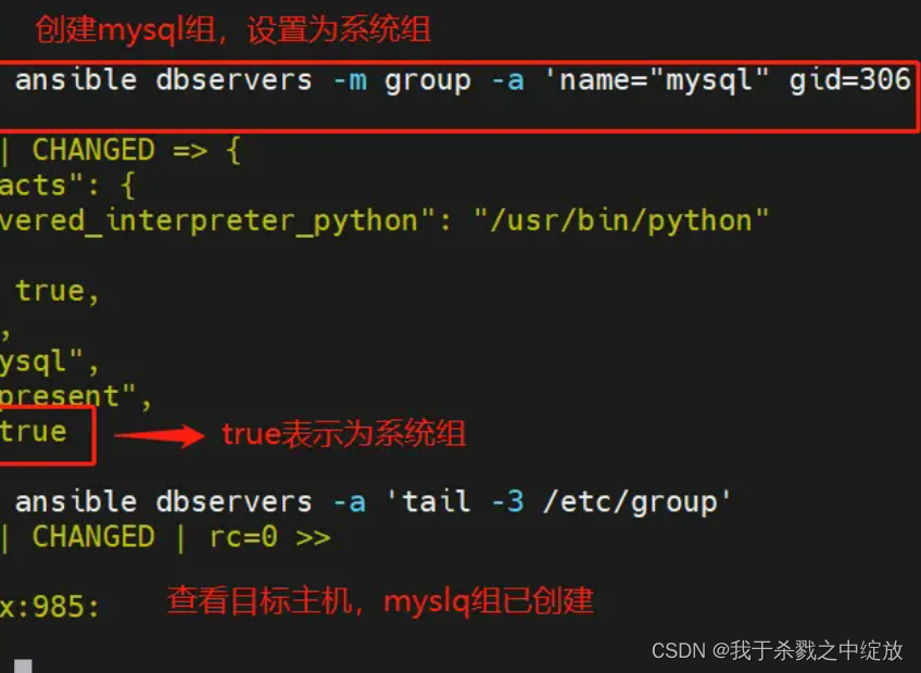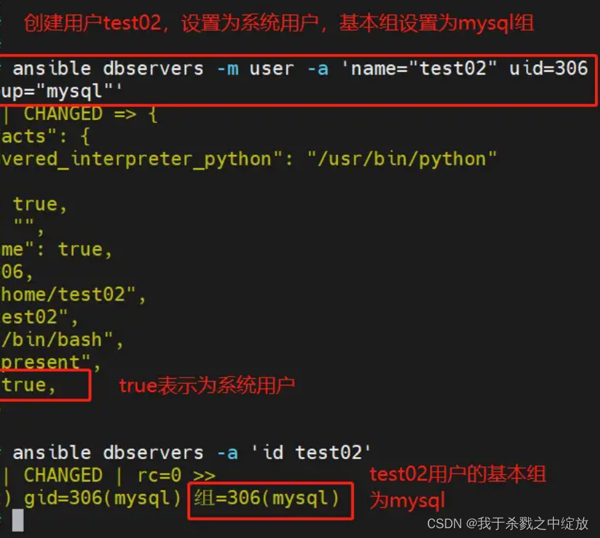 ansible dbservers -m user -a 'name="test02" uid=306 system=yes group="mysql"'