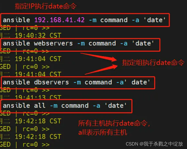 ansible dbservers -m command -a' date' #指定dbservers组执行date命令