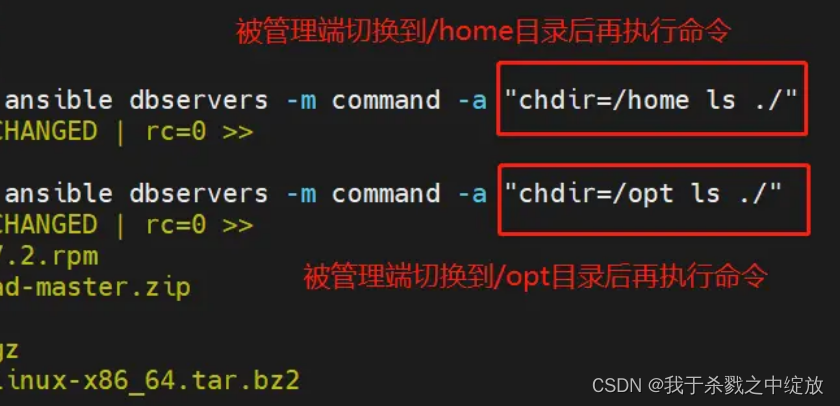 [root@yuji ~]# ansible dbservers -m command -a "chdir=/opt ls ./"