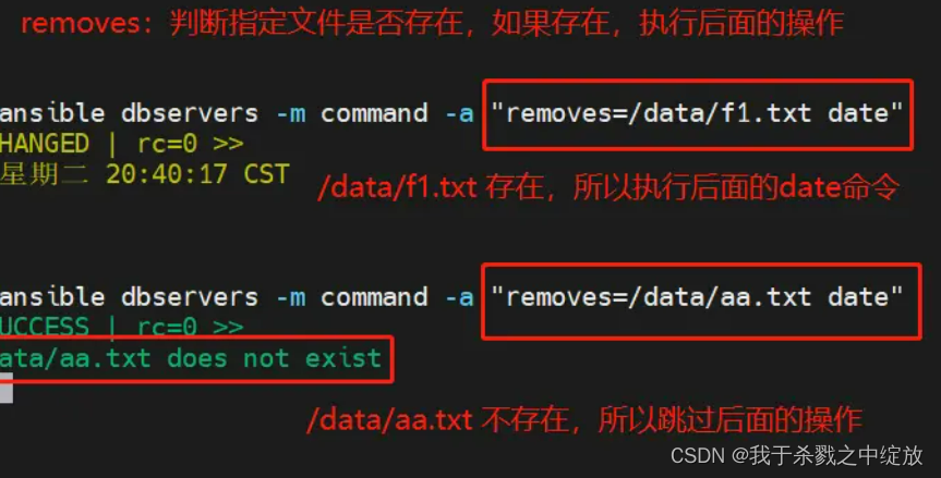 ansible dbservers -m command -a "removes=/data/f1.txt date"