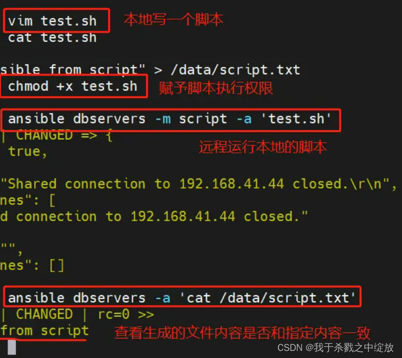 ansible dbservers -a 'cat /data/script.txt' #查看生成的文件内容是否为指导内容