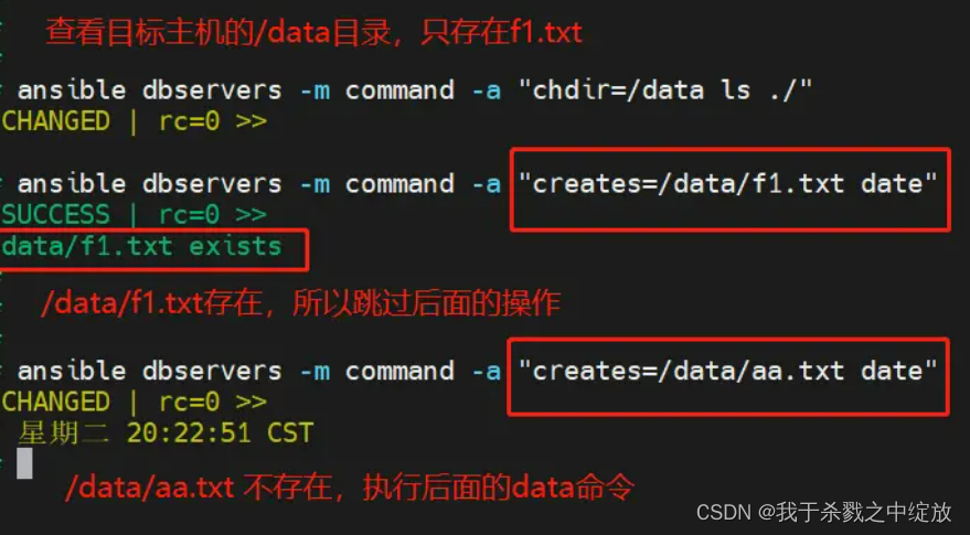 ansible dbservers -m command -a "creates=/data/f1.txt date"