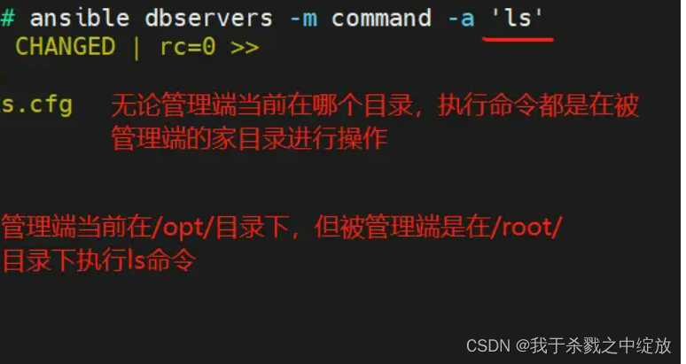 ansible dbservers -m command -a "chdir=/home ls ./" #切换到/home目录下再执行命令