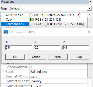点击晶胞,然后Properties选项卡中找到分数坐标(FractionalXYZ):