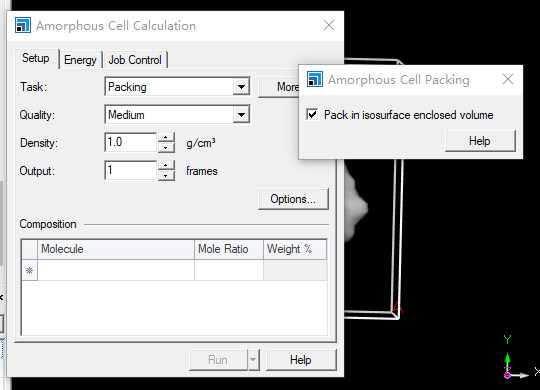 点击Modules选项栏中Amrophous Cell中的Calculation,进入下面界面,将Task换为Packing,并且点击右边Matching,确保勾选了Pack in isosurface enclose volume:
