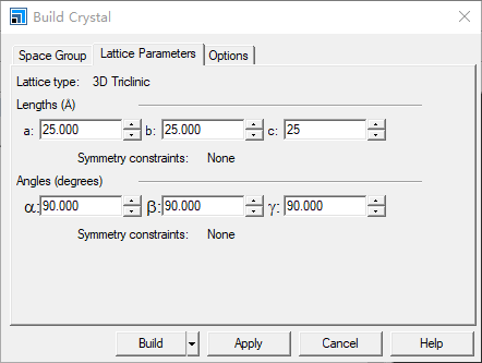然后再创建一个文件,首先创造一个xsd文件,然后点击Build选项卡中的Cystals中的Build Cystals,为了方便实验,这里晶胞长度均设置为25: