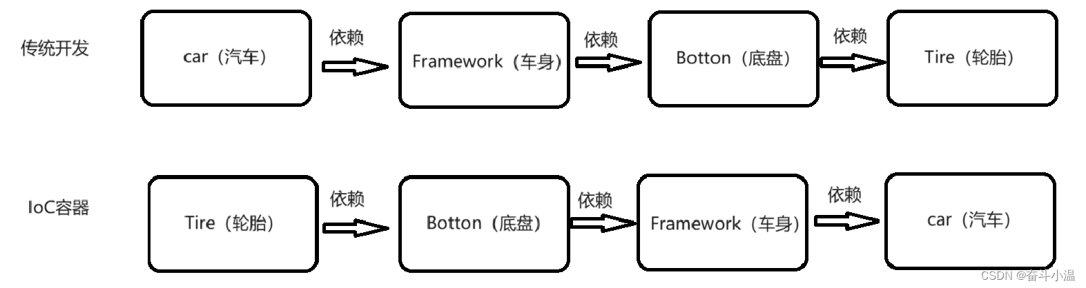 通⽤程序的实现代码,类的创建顺序是反的,传统代码是 Car 控制并创建了Framework,Framework 创建并创建了 Bottom,依次往下,⽽改进之后的控制权发⽣的反转,不再是上级对象创建并控制下级对象了,⽽是下级对象把注⼊将当前对象中,下级的控制权不再由上级类控制了,这样即使下级类发⽣任何改变,当前类都是不受影响的,这就是典型的控制反转,也就是 IoC 的实现思想。