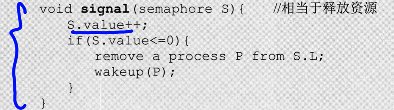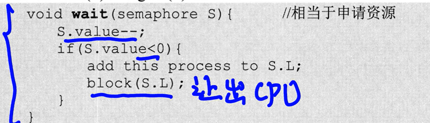 如果发现里面的值小于0了,说明这个资源已经被分配完了,就把这个进程添加到队列,并让出CPU(运行变堵塞)
