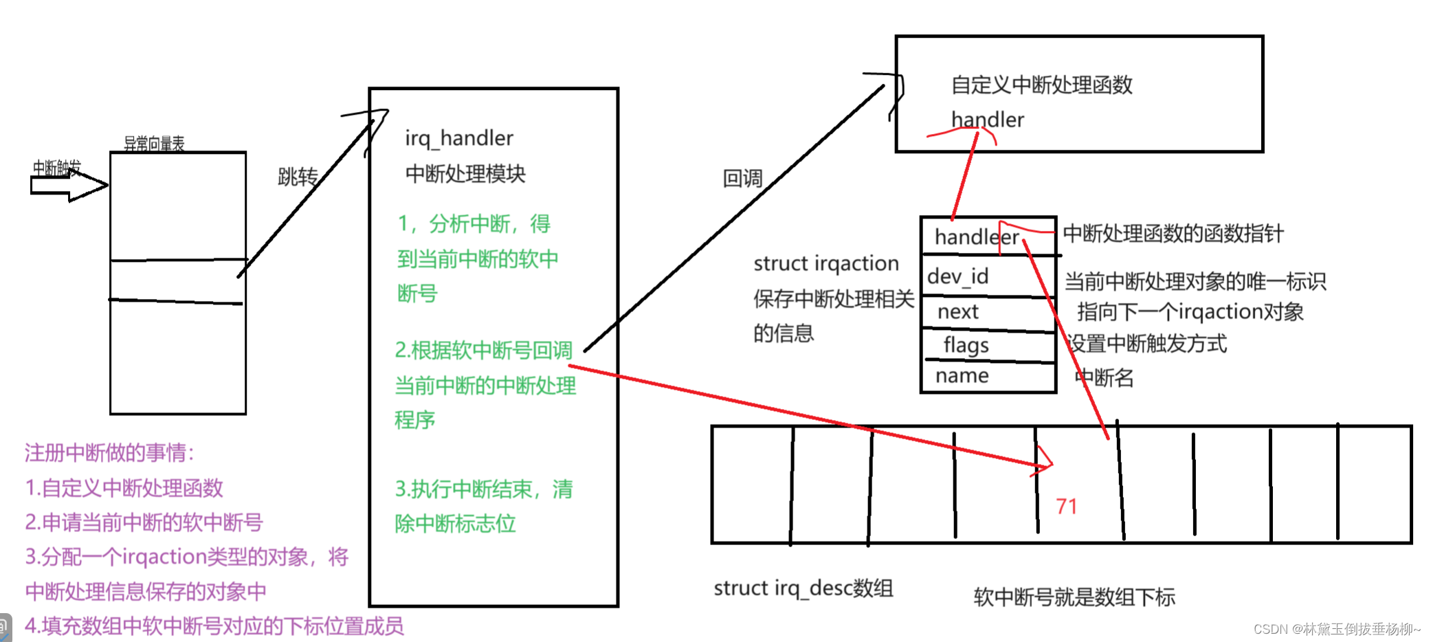 将一个中断处理得分过程分为了中断顶半部和中断底半部,中断顶半部就是通过 request_irq注册的中断处理函数,在顶半部中主要进行一些重要的、不耗时的任务;中断底半部则是区进行一些耗时,不紧急的任务。在执行中断底半部时,会将执行中断顶半部时关闭的中断线启用以及抢占开启,这样进程以及其他的中断就可以正常的工作了。